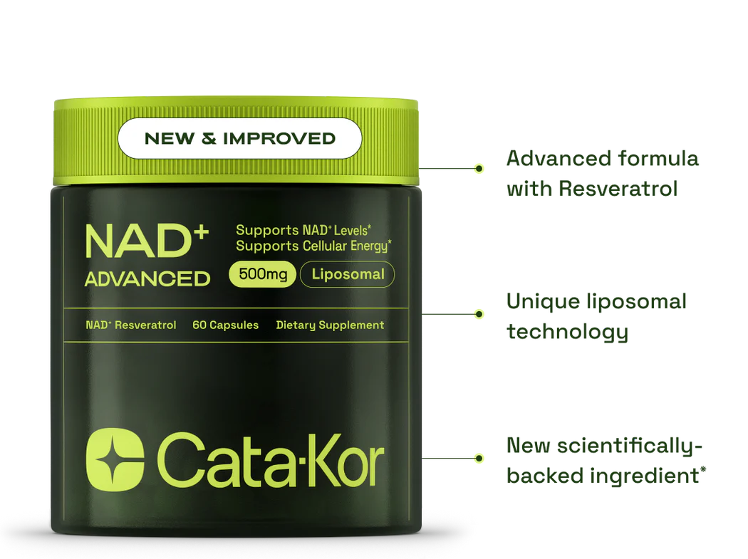Cata-Kor NAD+ is a premium supplement designed to support healthy aging and boost overall wellness. Formulated with Nicotinamide Riboside and Resveratrol, it enhances cellular health, promotes DNA repair, supports heart and brain function, and helps increase energy levels naturally. Ideal for those seeking to maintain vitality and mental clarity, Cata-kor NAD+ is your ally in the journey toward optimal longevity and performance